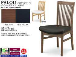 ダイニングチェア 「パロウ」チェア ■タモ材木部、PVCレザー座面のハイバックチェア ・チェアは、タモ材・LBR色、MBR色の2色ウレタン塗装 ・チェア座面は、WH/BK色PVCレザーです。 ・MADE IN VIETNAM 【基本仕様】 □チェア:W47×D57×H84.5/SH43cm ・材質:タモ材・ウレタン塗装木部、LBR/MBR色 ・座面:PVCレザー/BK・WH色 ・肘無チェア:1箱2脚入り(数量1個)での販売となります。 ・※肘無チェアは、偶数個でのご購入でお願いします。 ・但し、販売価格の表示は、1脚あたりの価格となってます。 ◆ご注意 ・人気商品の為、しばしば在庫切れが発生 ・必ず、事前の在庫の問い合わせをお願いします ・他のテーブルサイズ、チェアの組合せは、単品ページをご覧下さい。 ★会員登録で更にお買い得 ・サイト左上より、簡単に登録いただけます。 ・モニターにより、実物の色と異なることがあります。 ・送料無料(北海道・離島除く)でお届けします。 ・この家具の配送は、基本として開梱込価格です。 □メーカー指定販売価格の為、具体的な価格は、本数、組み合わせ、 ・配送先住所、配送方法を明記の上、お問い合わせください。 ・MAILにて、ご案内させていただきます。 |