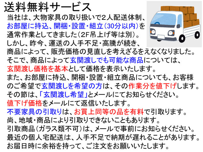リビングダイニング 「未来」4点セット ・1500テーブル、1300背付ベンチ、回転チェア2脚の組合せ ■がっちりした作りのリビングダイニング4点セット ・がっちりしたラバーウッド集成無垢材がポイントのセットです。 ・150cm幅、68cm高のラバーウッド集成天無垢材天板テーブル ・無垢木部フレームにファブリック張地タイプチェア ・R曲面背座面の130cm幅背付ベンチと幅広座面回転チェア ■違う組合せでもご購入いただけます。 ・MADE IN THAILAND 【基本仕様】 □「未来」1500テーブル:W150×D90×H68cm(組立式) ・材質:ラバーウッド集成無垢材、ウレタン塗装 ・天板厚40mm、集成無垢材の為、斑模様です。 ・テーブル天板は、横面になぐりを入れてボリュームを出しています。 □「未来」1300背付ベンチ:W130×D70×H76/SH41cm □「未来」回転チェア:W50×D60×H78/SH42cm×2脚 ・木部:ラバーウッド集成無垢材・ウレタン塗装 ・張地:ファブリック ・詰物:ウレタンフォーム ・金属回転盤で,360度スムーズに回転します。 ◆ご注意 ★会員登録で更にお買い得 ・サイト左上より、簡単に登録いただけます。 ・送料無料(北海道・沖縄・離島除く)でお届けします。 ・こちらの大型家具の配送は、開梱・組み立て込価格です。 □下記の区域内では、開梱、組み立て、お部屋入れ込みの価格 ・本州全域、四国、九州全域(沖縄を除く) ・但し、離島と一部山間地等は、 開梱対応できない区域も有りす。 ・お届先を、MAILにて具体的にお問合せ下さい。 ・人気商品のため、在庫確認をお願いします。 ・お届けは、約10日間ほど時間が必要になります。 ・モニターにより、実物の色と異なることがあります。 |